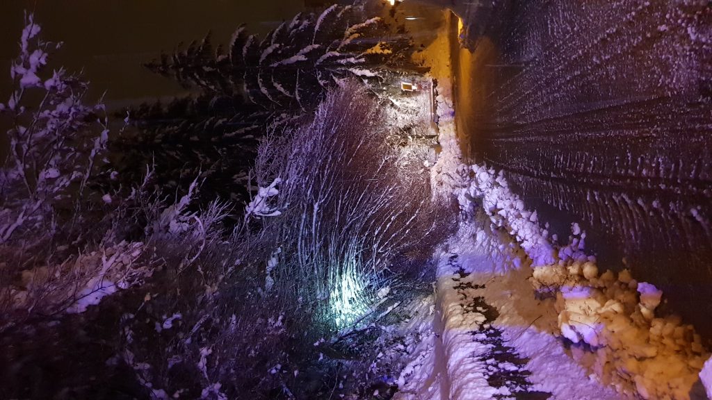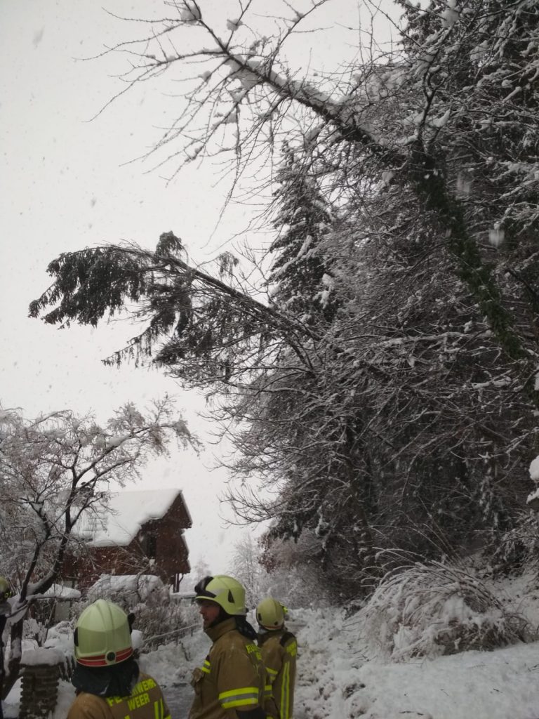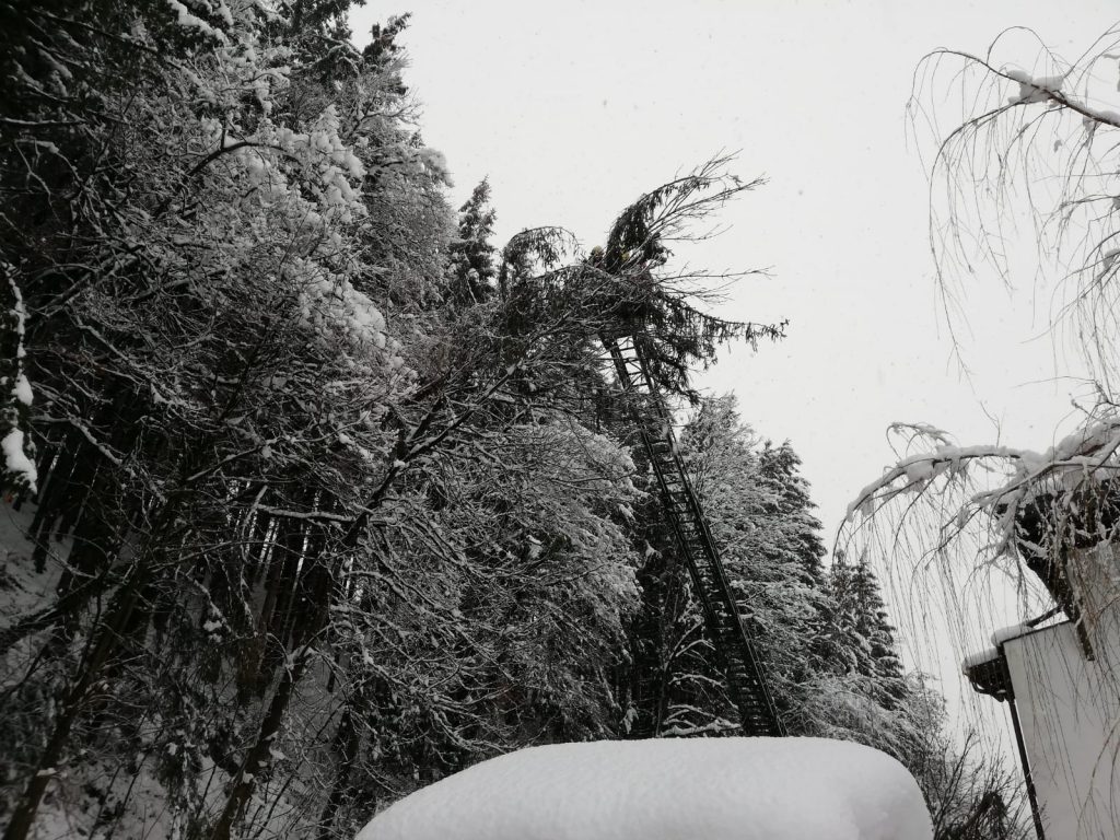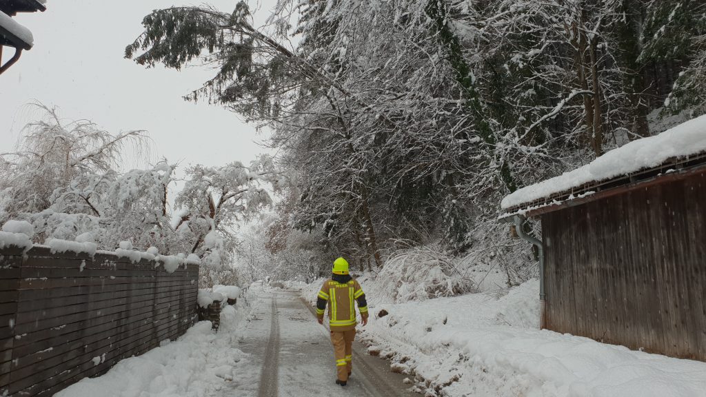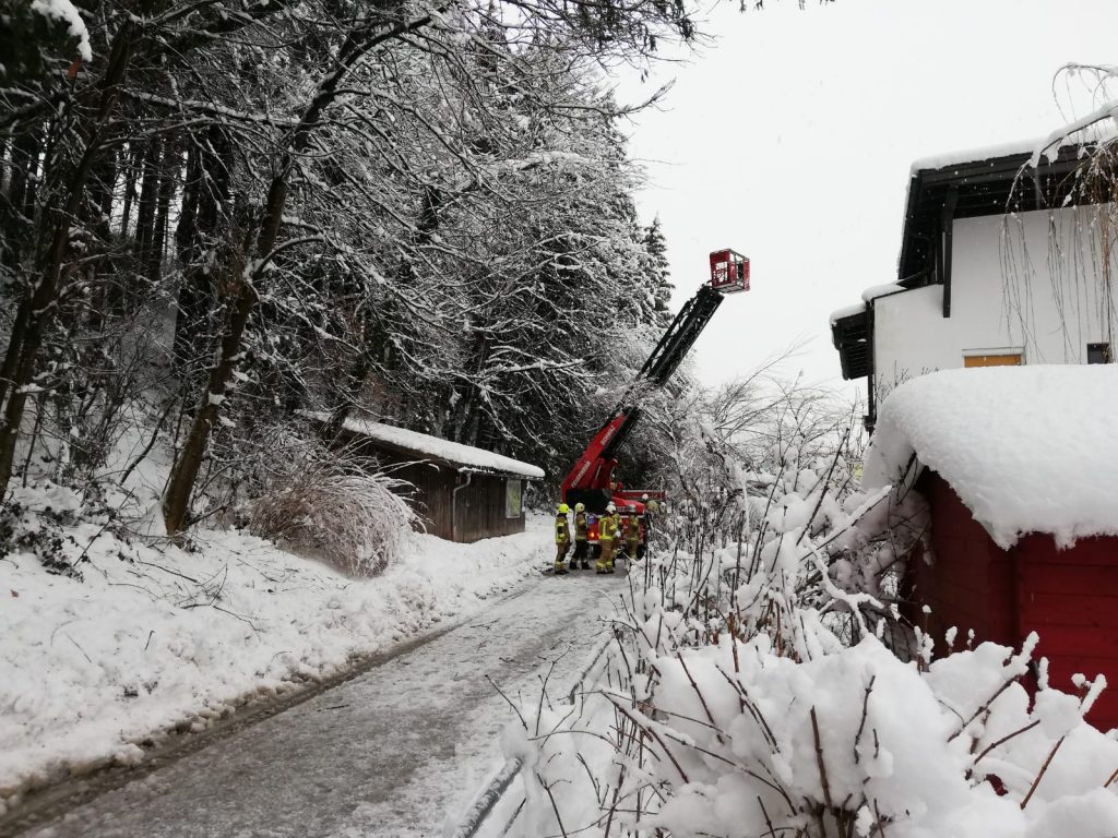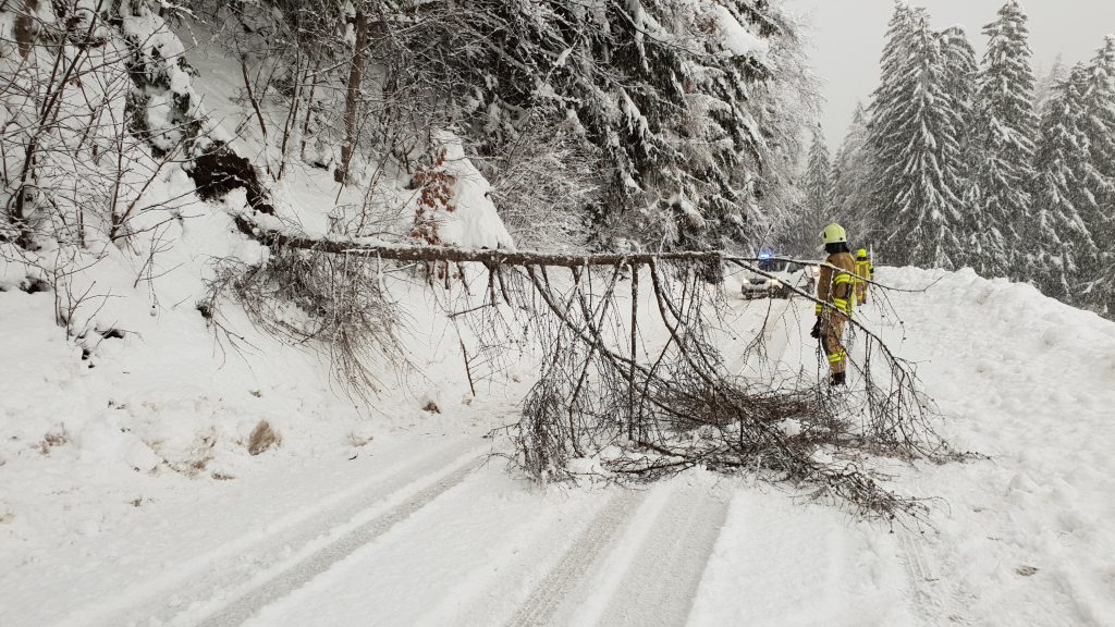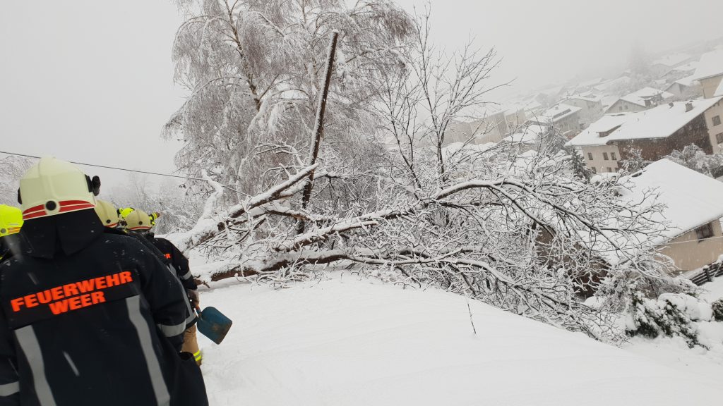 Um 6:15 ging der erste Alarm ein. Ein größerer Strauch neben der Klockerbichlstraße Richtung Weerberg hing über die Fahrspur und musste zurückgeschnitten werden. Da wir aufgrund des vor allem nassen Schnees weitere Probleme vermutet wurden, entschied man sich das Ortsgebiet abzufahren und zu kontrollieren. Dabei wurde ein weiterer Baum, der auf einen Telefonmasten gefallen war und ein Baum quer über die Straße an der Grenze des Gemeindegebiets zu Weerberg gefunden. Beide wurden von uns entfernt. Die gefährlichste Situation befand sich am Rinderweg, wo ein ausgerissener Baum auf einen anderen draufgefallen war und über die Straße in ein Grundstück hineinragte. Nach Rücksprache mit dem Waldaufseher entschied man sich, die Bäume vorsichtig vom Gipfel her Stück für Stück zurückzuschneiden. Dazu wurde die DLK Schwaz nachalarmiert.